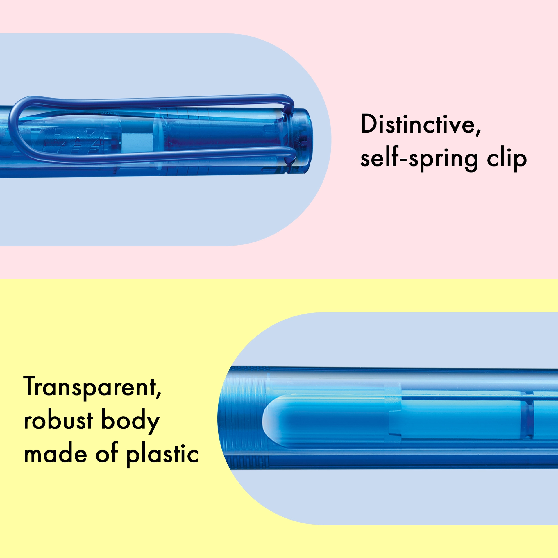 Der LAMY balloon ist ein farbenfroher Hingucker, der vor allem im Alltag und in den Händen von Vielschreiber:innen zur Höchstform aufläuft. Er basiert auf dem Design des ikonischen LAMY safari und ist der perfekte Begleiter für alle, die es bunt und modern mögen. Ein markanter, selbstfedernder Clip hält ihn sicher an Ort und Stelle befestigt, das transparente Gehäuse aus schlagzähem Kunststoff hält allen Herausforderungen stand und die abgeflachte Form verhindert versehentliches Wegrollen. Dank subtil ergonomisch geformter Griffflächen und einer nachfüllbaren Tintenrollerpatrone bietet er ein besonders angenehmes Schreibgefühl und macht einfach rundum gute Laune.