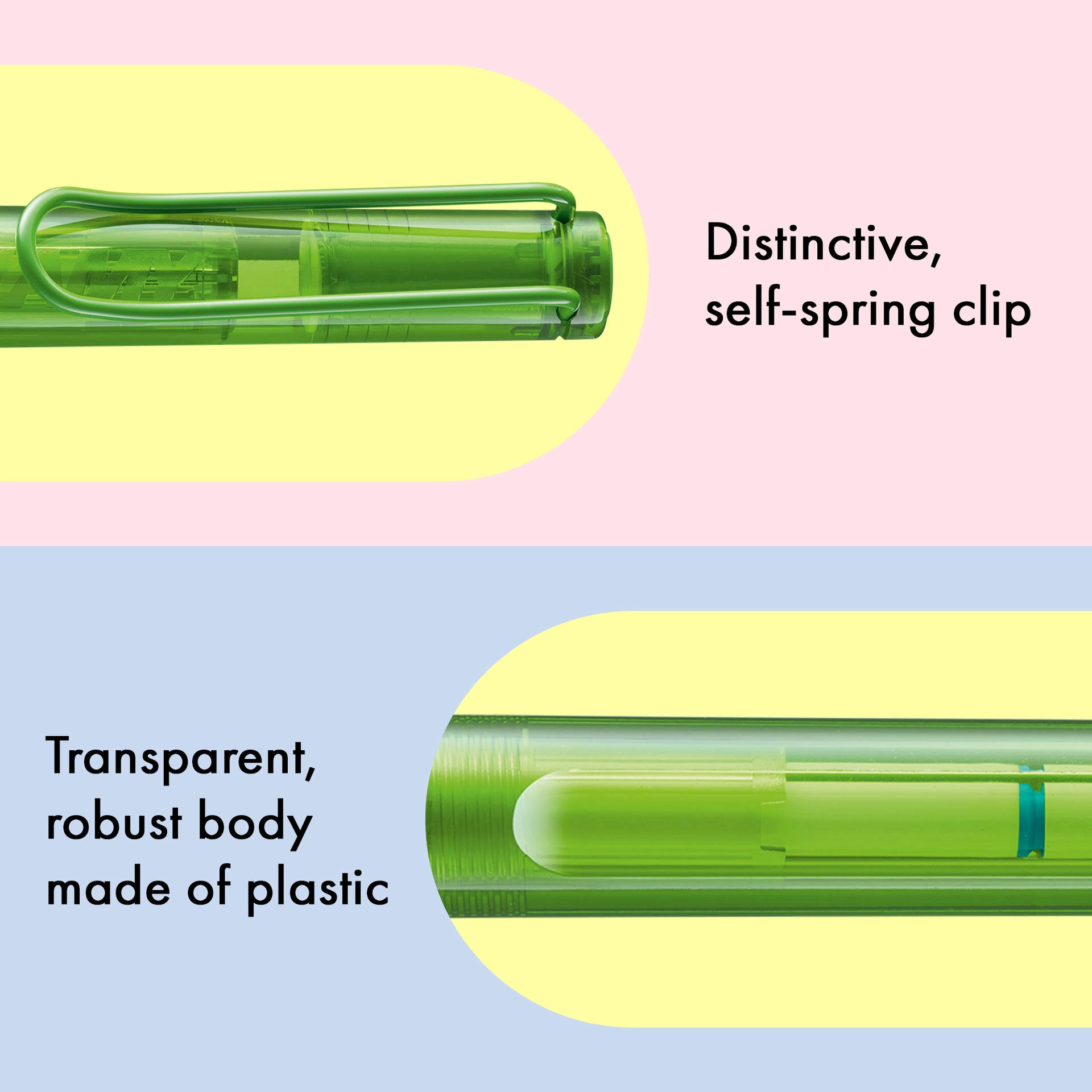 Der LAMY balloon ist ein farbenfroher Hingucker, der vor allem im Alltag und in den Händen von Vielschreiber:innen zur Höchstform aufläuft. Er basiert auf dem Design des ikonischen LAMY safari und ist der perfekte Begleiter für alle, die es bunt und modern mögen. Ein markanter, selbstfedernder Clip hält ihn sicher an Ort und Stelle befestigt, das transparente Gehäuse aus schlagzähem Kunststoff hält allen Herausforderungen stand und die abgeflachte Form verhindert versehentliches Wegrollen. Dank subtil ergonomisch geformter Griffflächen und einer nachfüllbaren Tintenrollerpatrone bietet er ein besonders angenehmes Schreibgefühl und macht einfach rundum gute Laune.