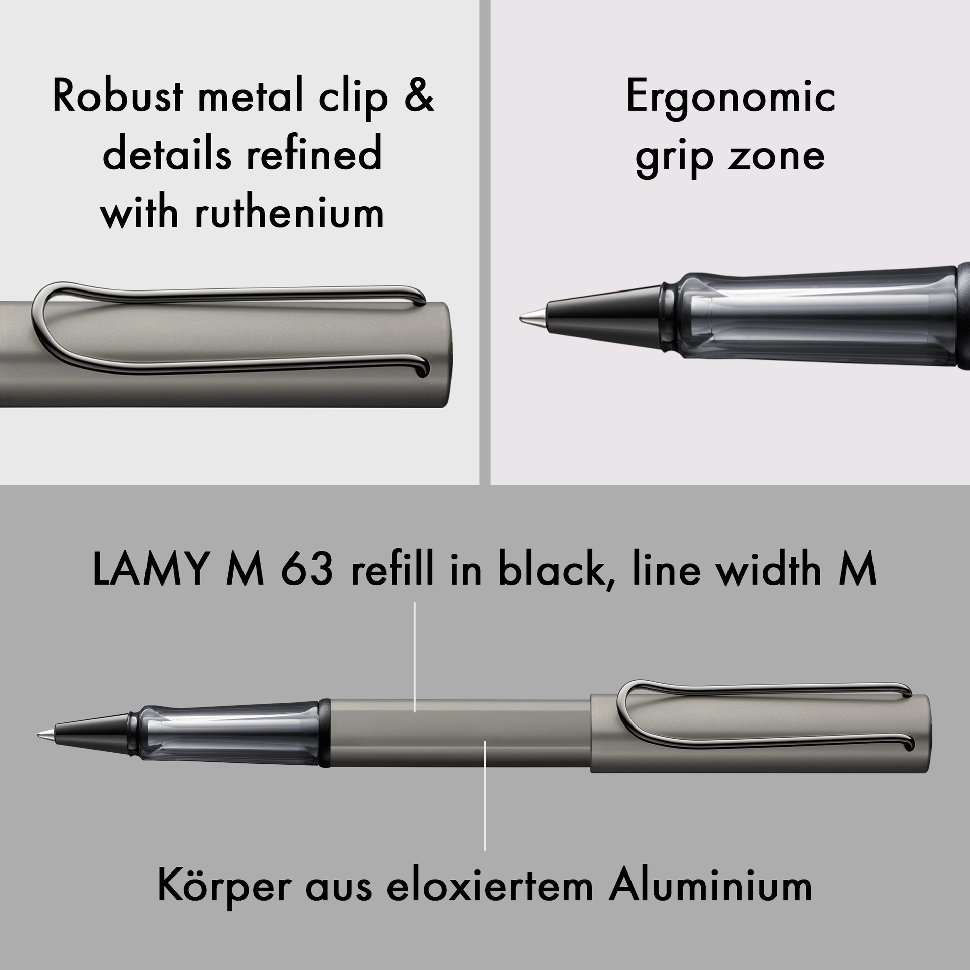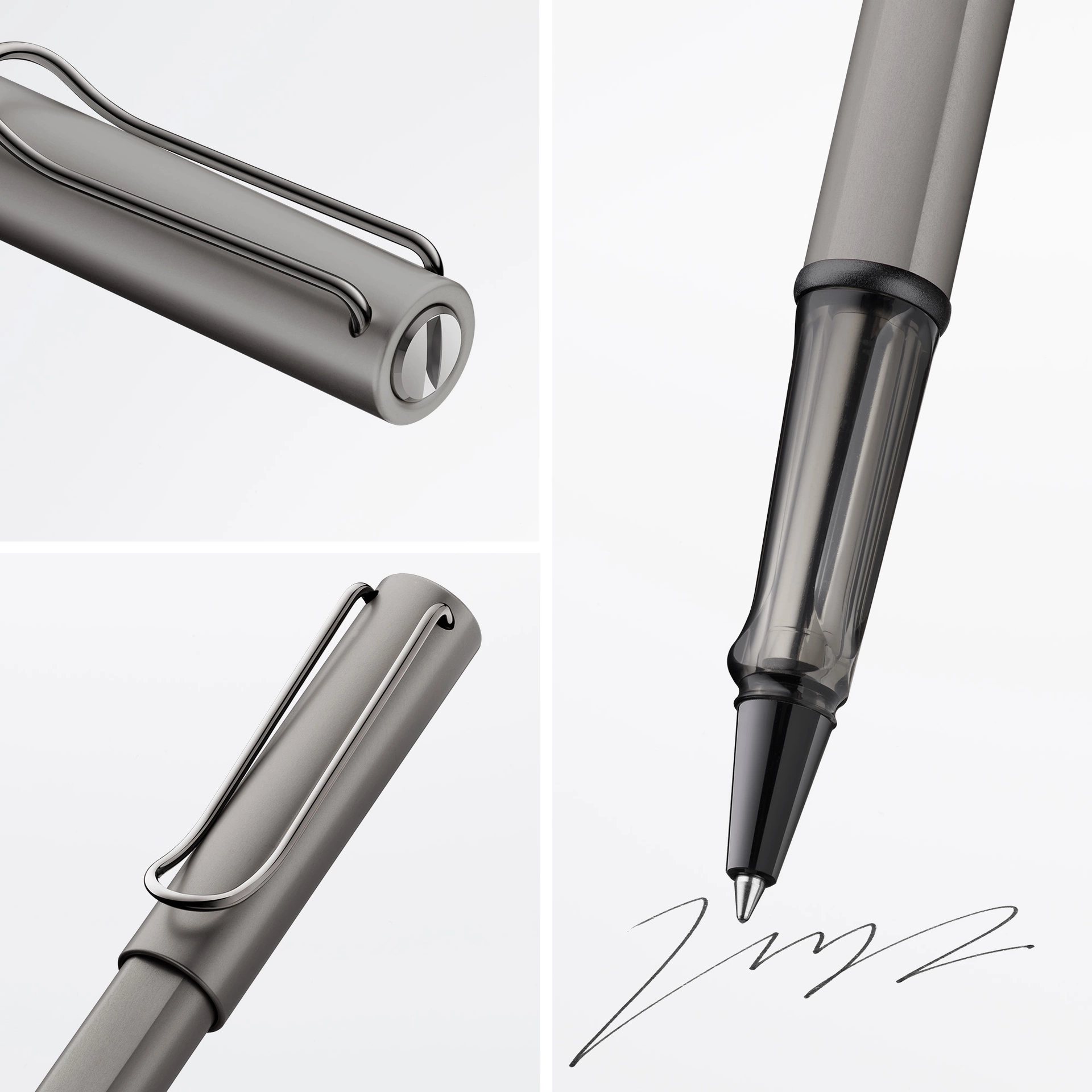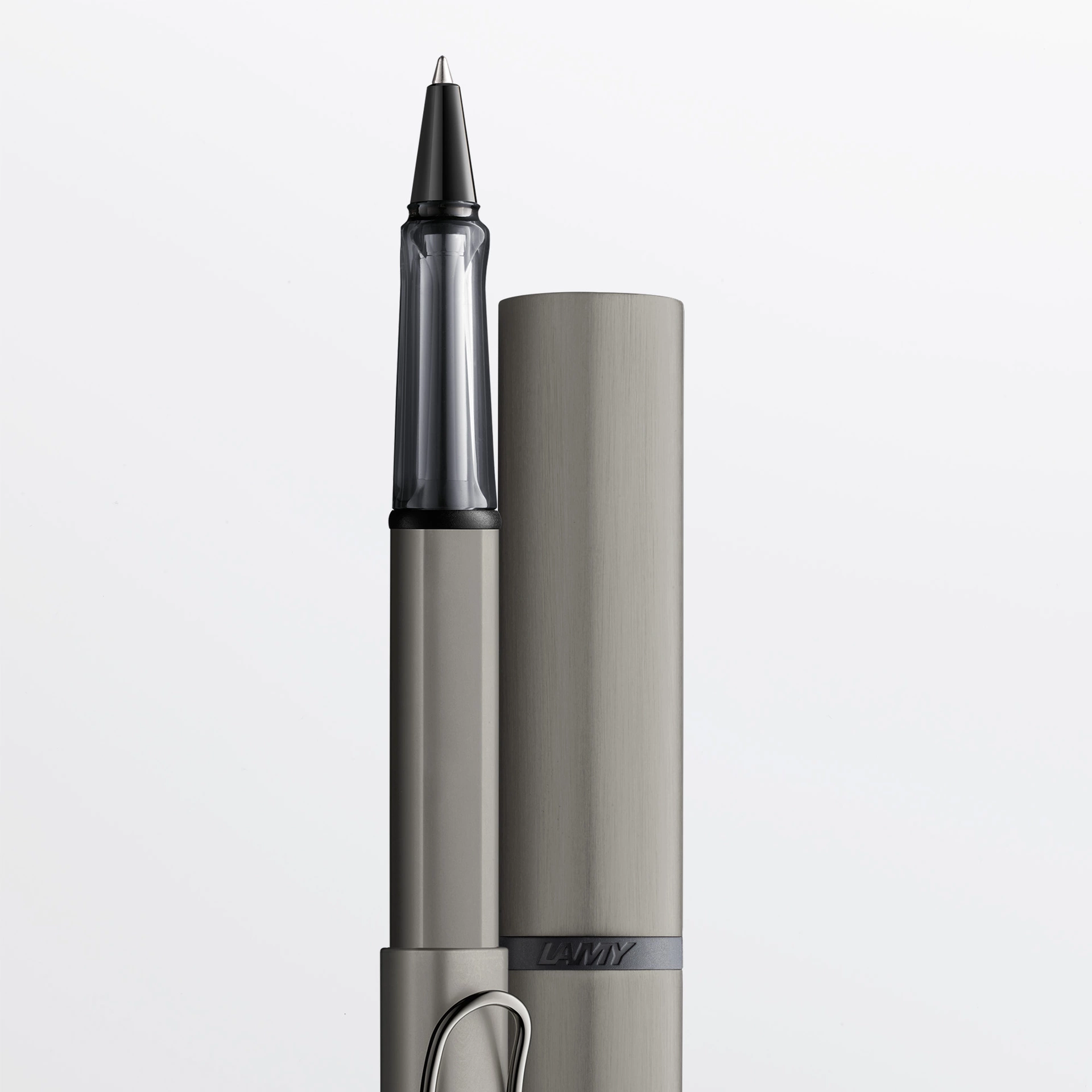 Tintenroller aus Aluminium, ergonomisches Griffstück aus transparentem Kunststoff, mit selbstfederndem Metallclip